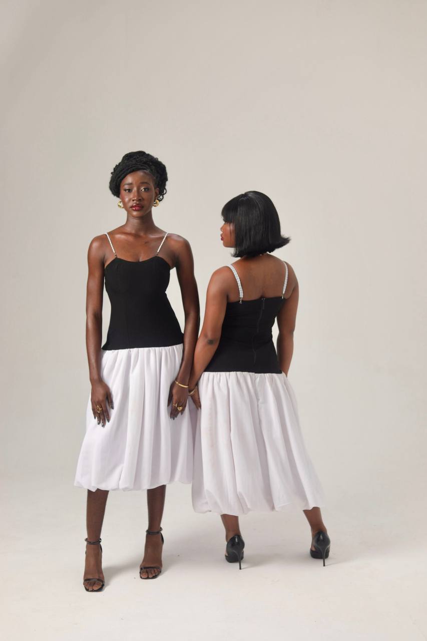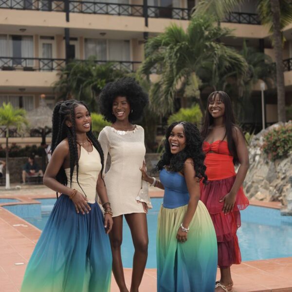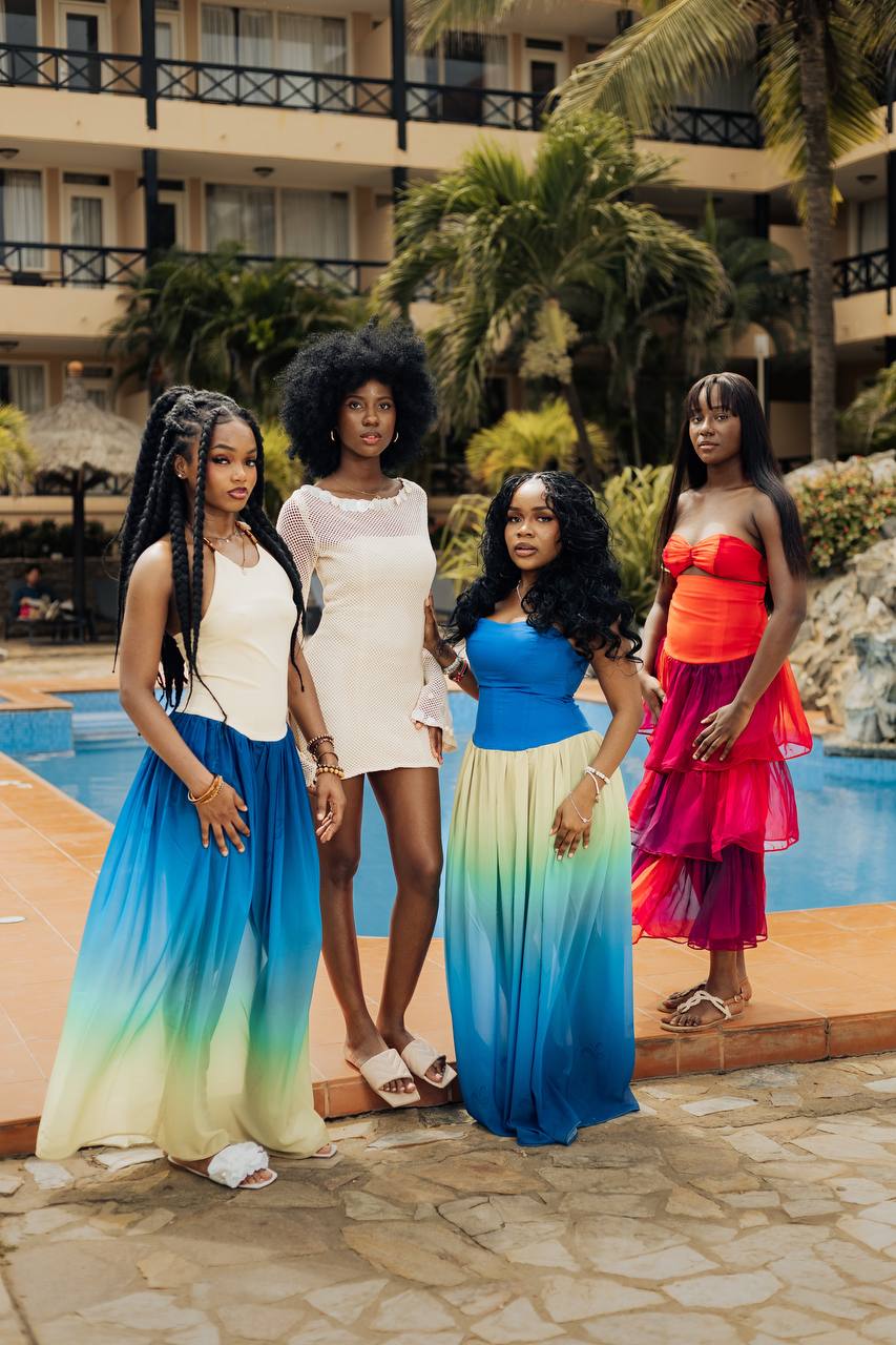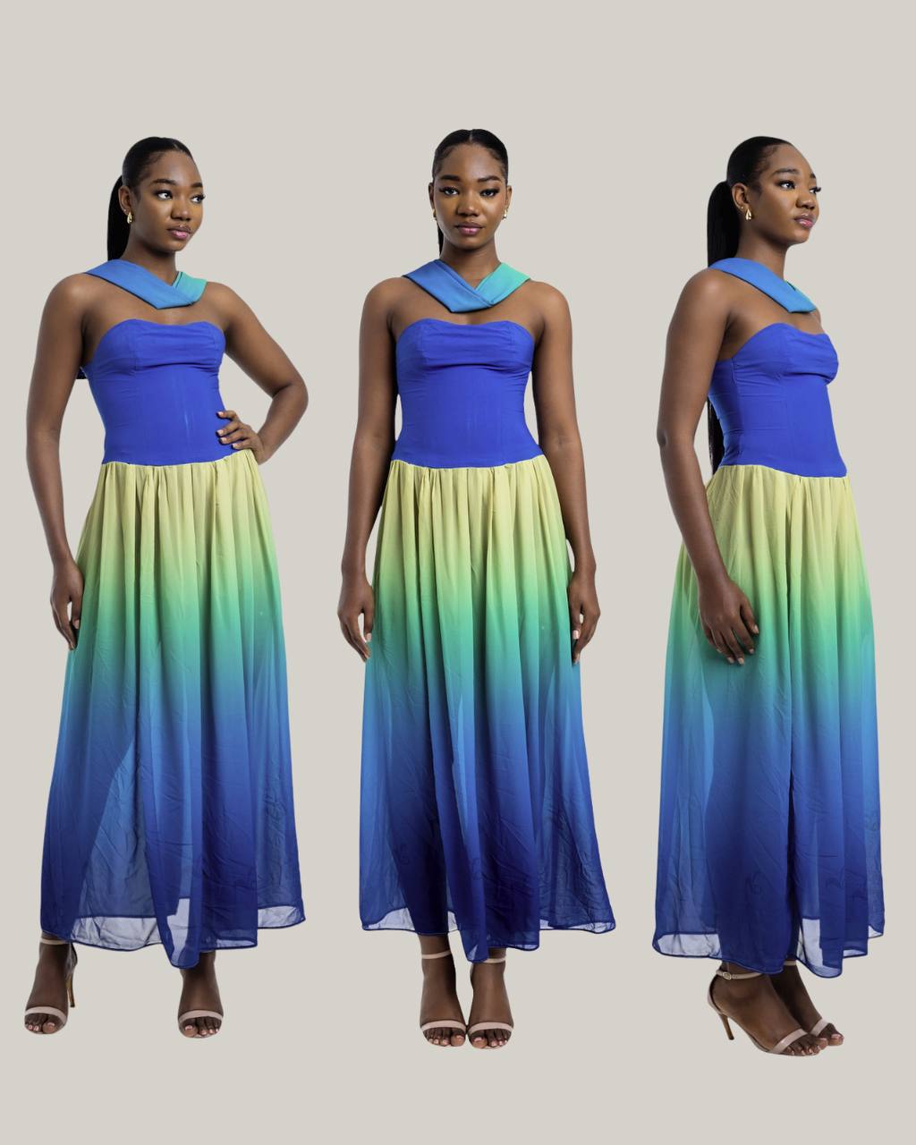 Delicate yet commanding, this strapless gown captures the beauty of the sea with its ombré flow from cool blue to gentle green. The fitted bodice provides elegant structure, while the full skirt glides with fluid grace. It’s soft, romantic, and made to turn vacation evenings into unforgettable moments.